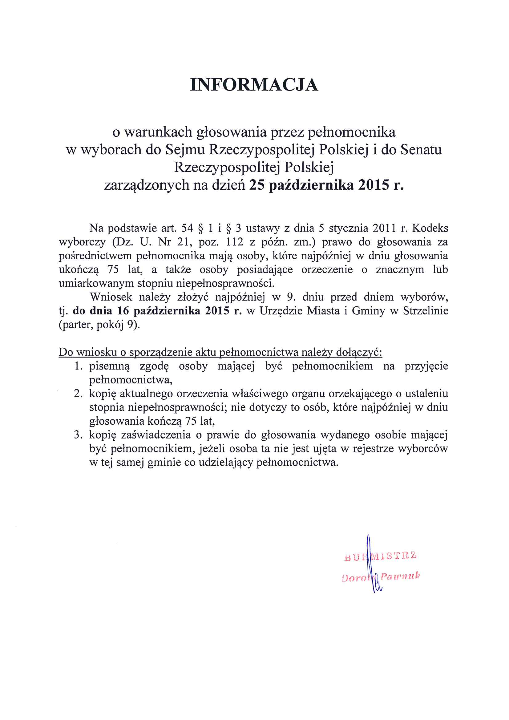 Uprzejmie informuję, że zgodnie z Uchwałą Nr XI/137/15 Rady Miejskiej Strzelina z dnia 25 sierpnia 2015 r. nową siedzibą Obwodowej Komisji Wyborczej Nr 10 na wybory do Sejmu RP i do Senatu RP, zarządzone na dzień 25 października 2015 r. będzie