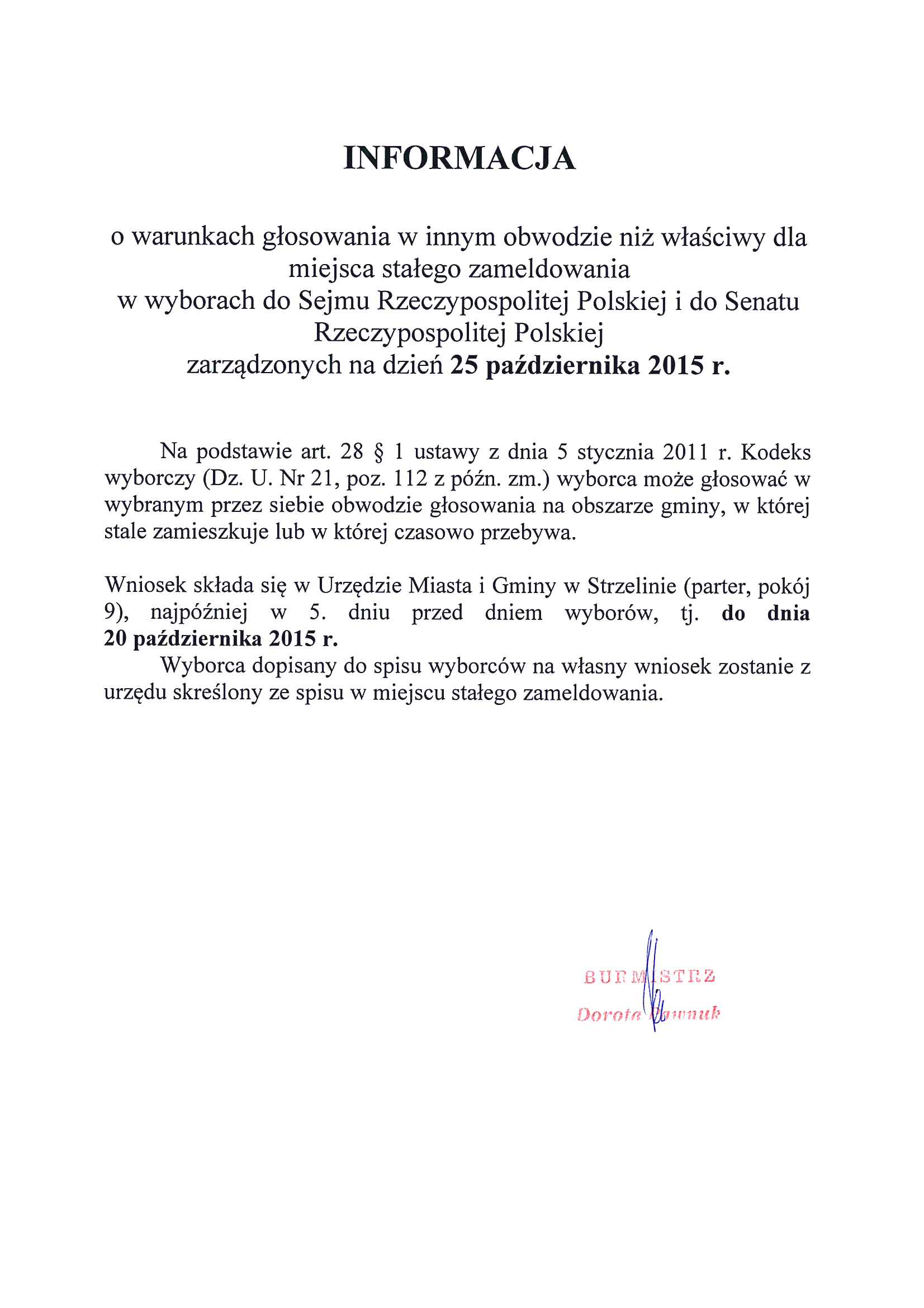 Informacja o warunkach głosowania w innym obwodzie niż właściwy dla miejsca stałego zameldowania w wyborach do Sejmu Rzeczypospolitej Polskiej i do Senatu Rzeczypospolitej Polskiej, zarządzonych na dzień 25 października 2015 r.