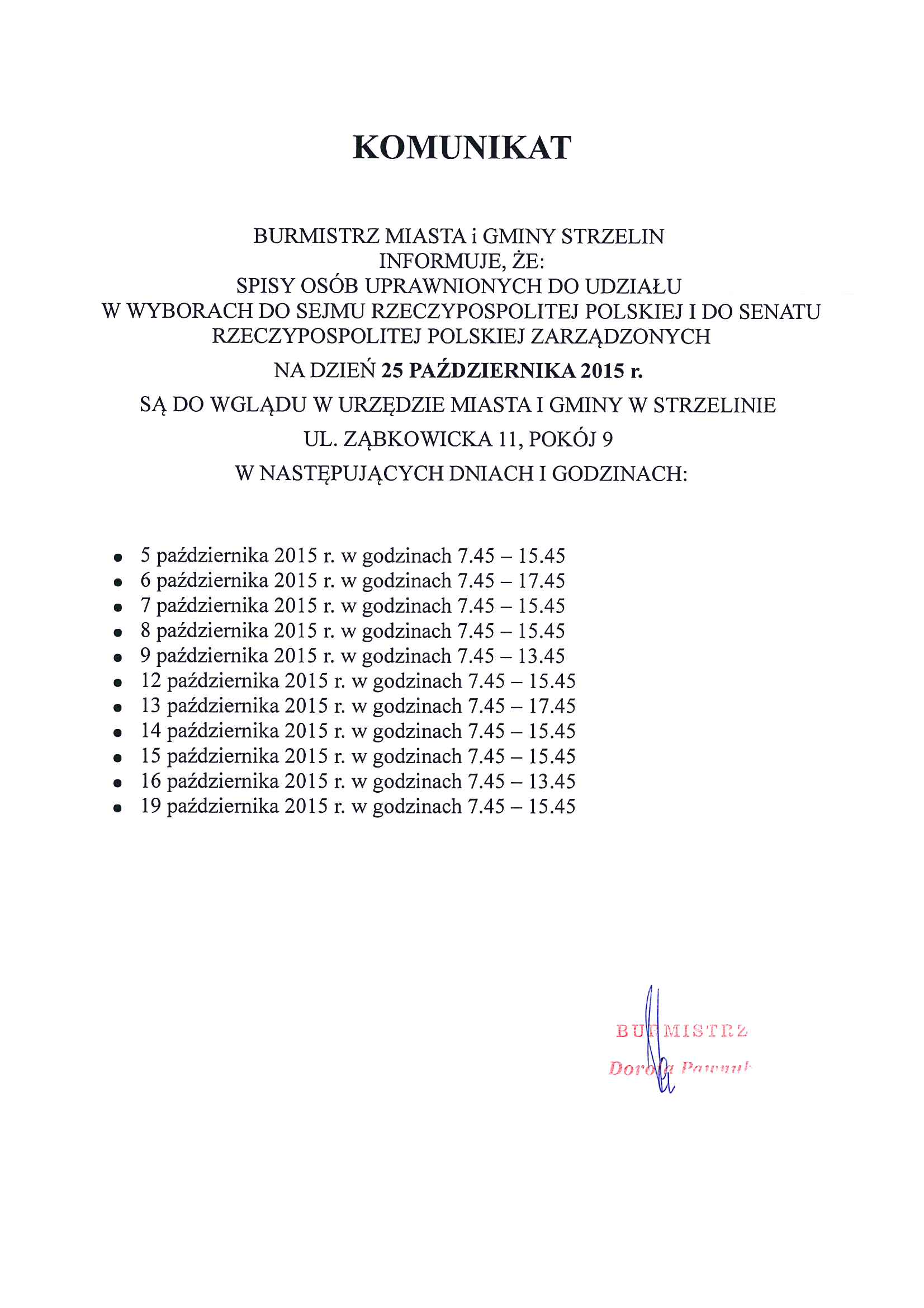 o wyłożeniu do wglądu spisu osób uprawnionych do udziału w wyborach do Sejmu Rzeczypospolitej Polskiej i do Senatu Rzeczypospolitej Polskiej, zarządzonych na dzień 25 października 2015 r.