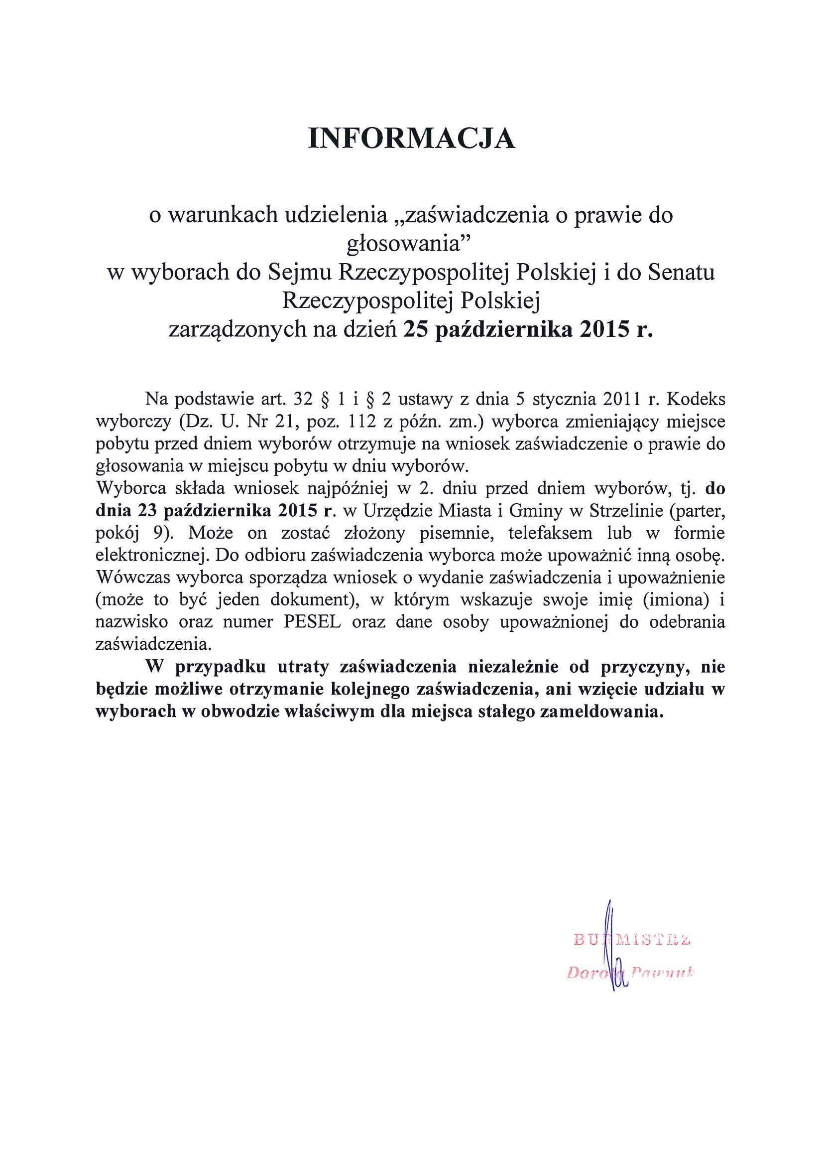 w wyborach do Sejmu Rzeczypospolitej Polskiej i do Senatu Rzeczypospolitej Polskiej, zarządzonych na dzień 25 października 2015 r.