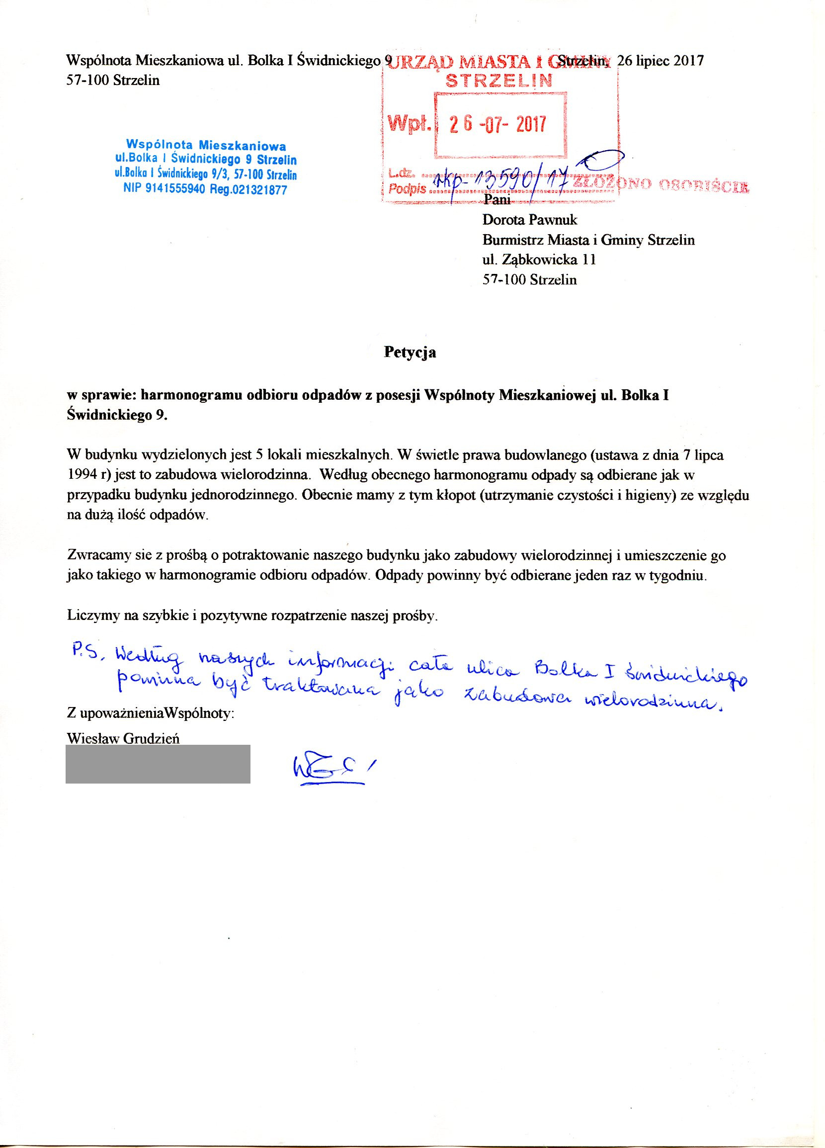 Petycja w sprawie harmonogramu odbioru odpadów z posesji Wspólnoty Mieszkaniowej ul. Bolka I Świdnickiego 9