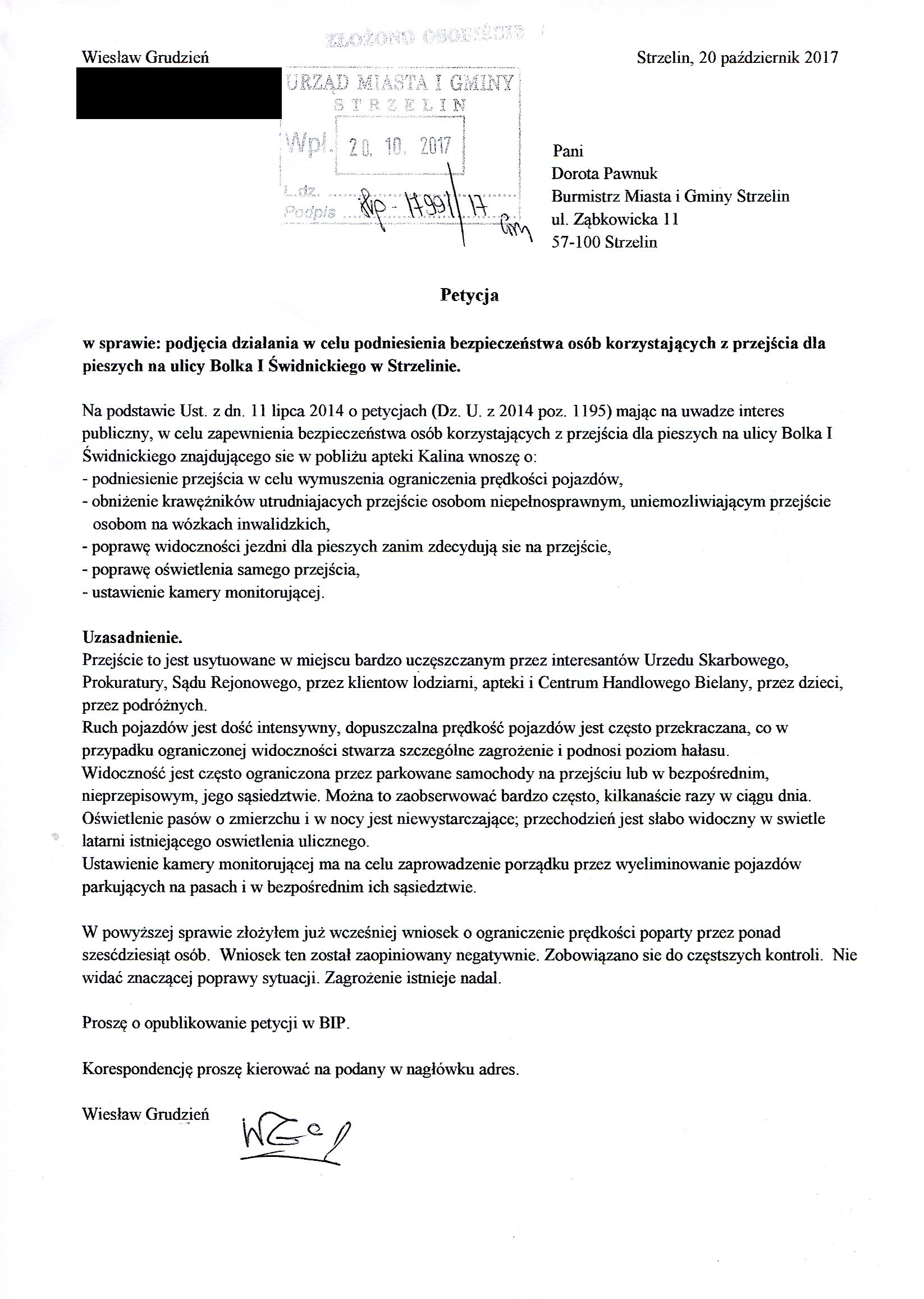 Petycja w sprawie podjęcia działania w celu podniesienia bezpieczeństwa pieszych korzystających z chodników wzdłuż ulicy Królowej Jadwigi w Strzelinie