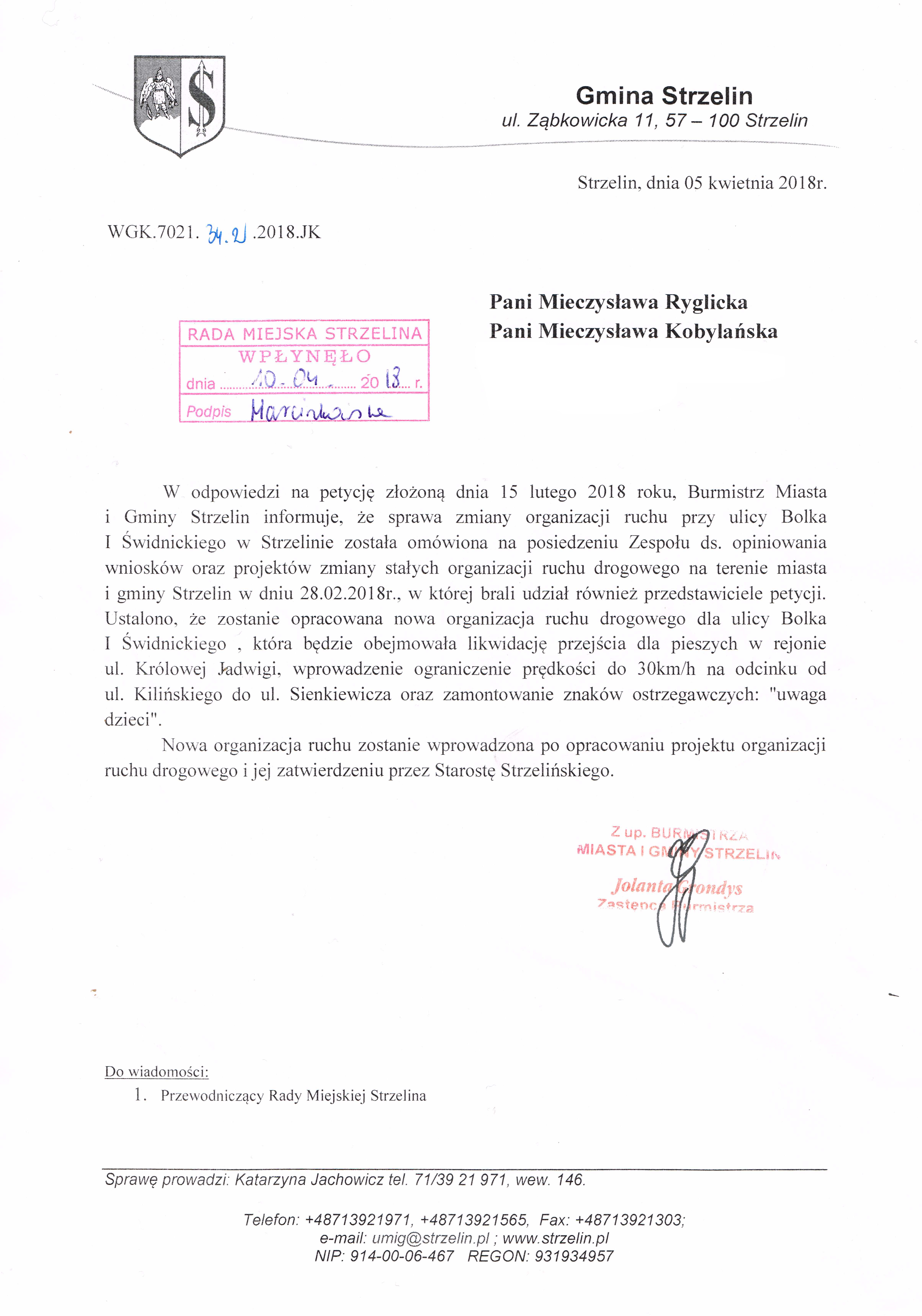 Petycja o przeniesienie przejścia dla pieszych, znajdującego się na ulicy Bolka I Świdnickiego przy posesji o nr 8, złożona przez mieszkańców, przedsiębiorców, radę Osiedla Zachodniego w Strzelinie oraz pracowników urzędów znajdujących się przy ul. Bolka I Świdnickiego do Przewodniczącego Rady Miejskiej Strzelina