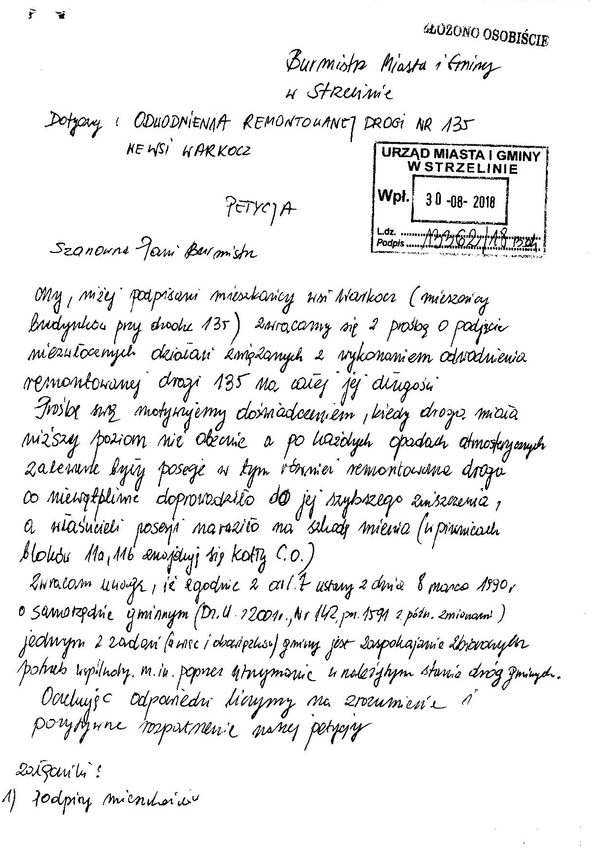 Petycja w sprawie zainstalowania oświetlenia ulicznego, złożona przez mieszkańców wsi Pławna