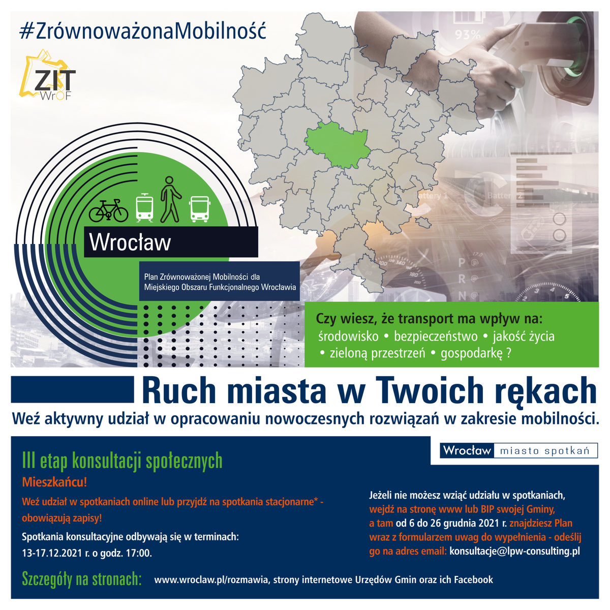 Pod poniższym linkiem od 6 grudnia 2021 r. jest możliwość zapoznania się z projektem dokumentu „Plan Zrównoważonej Mobilności dla Miejskiego Obszaru Funkcjonalnego Wrocławia” wraz z Prognozą oddziaływania na środowisko.